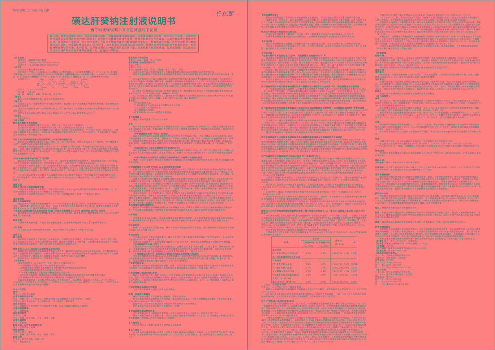 本品用于進行下肢重大骨科手術如髖關節(jié)骨折、重大膝關節(jié)手術或者髖關節(jié)置換術等患者,預防靜脈血栓栓塞事件的發(fā)生。用于無指征進行緊急(<120分鐘)侵入性治療(PCI)的不穩(wěn)定性心絞痛或非ST段抬高心肌梗死(UA/NSTEMI)患者的治療。用于使用溶栓或初始不接受其它形式再灌注治療的ST段抬高心肌梗死患者的治療。